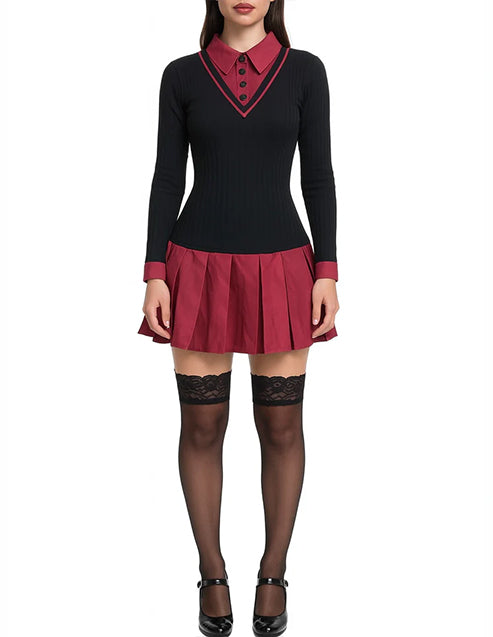 This pleated uniform inspired dress blends preppy polish with modern edge. Designed with a ribbed knit bodice and sharply tailored pleated skirt, it creates the illusion of a layered look, without the fuss.